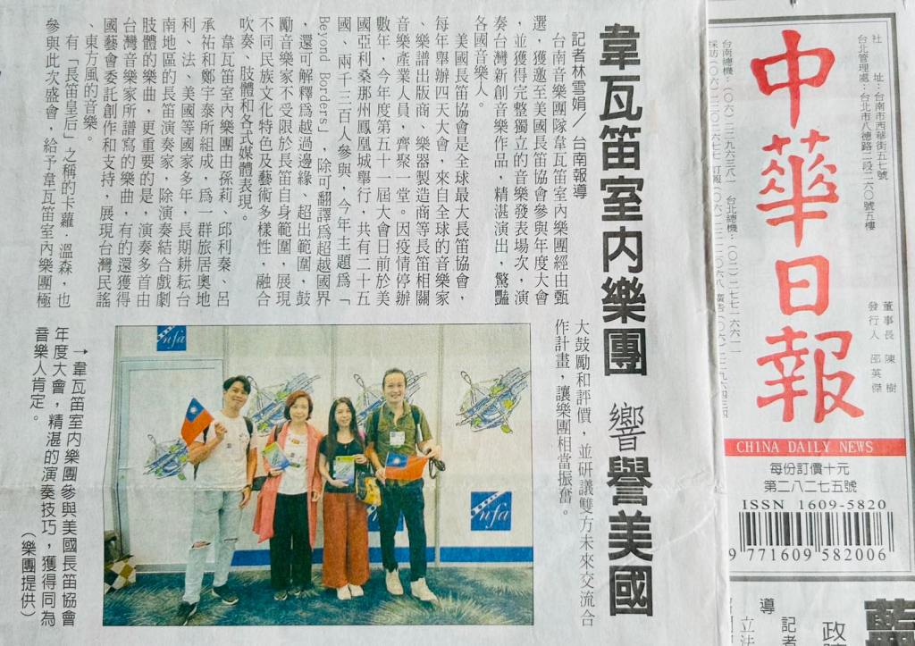 台南音樂團隊韋瓦笛室內樂團經由甄選,獲邀至美國長笛協會參與年度大會,並獲得完整獨立的音樂發表場次,演奏台灣新創音樂作品,精湛演出,驚豔各國音樂人。